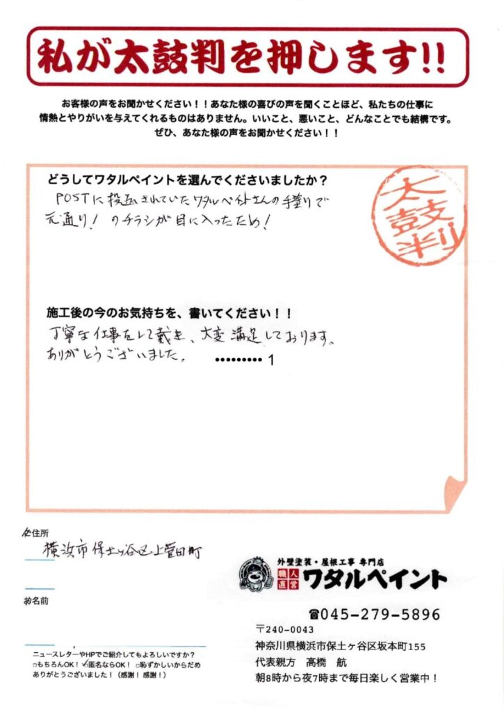 口コミ評判⭐️⭐️⭐️⭐️⭐️丁寧なお仕事をしていただき、大変満足しております。目次1 お客様の声1.1 ワタルペイントをお選びいただいた理由1.2 施工後のお気持ち2 こちらのお客様の工事詳細もご覧ください!お客様の声ワタルペイントをお選びいただいた理由ワタルペイントをお選びいただいた理由POSTに投函されていたワタルペイントさんの手塗りで元通り!のチラシが目に入ったため!施工後のお気持ちお客様の声(施工後のお気持ち)丁寧な仕事をしていただき、大変満足しております。ありがとうございました。こちらのお客様の工事詳細もご覧ください!関連記事汚れと色褪せがなくなり綺麗に大変身![保土ケ谷区上菅田町]無料お見積はこちら