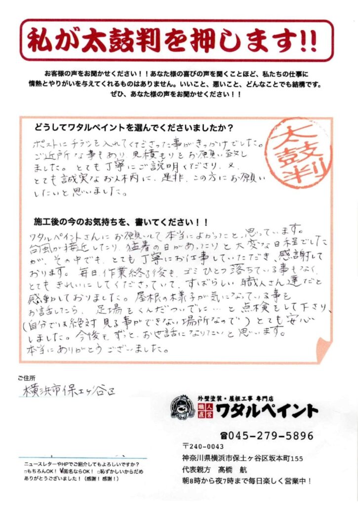 この度はワタルペイントをご信頼いただき、誠にありがとうございました。