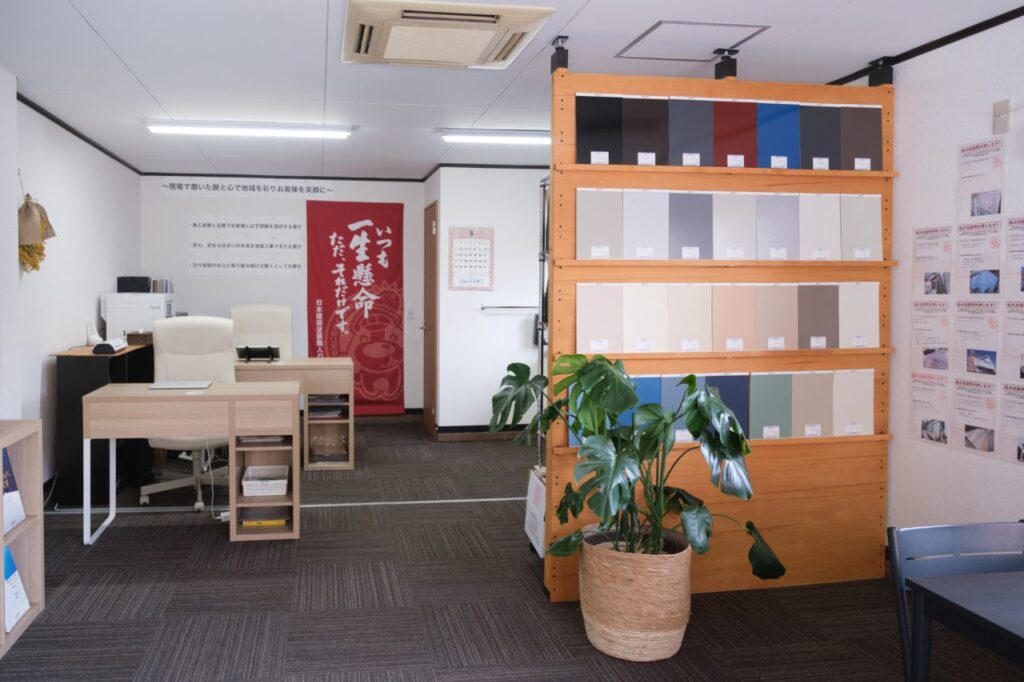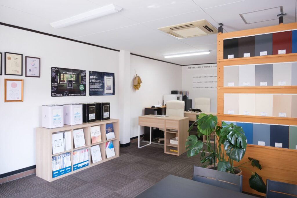 店内はこのようになっていて、たくさんの色見本や塗料に関する資料、実際のお客様のお声などをご覧になっていただけます。