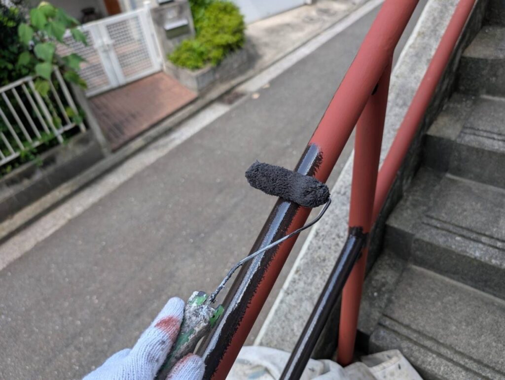 こういった鉄部の塗装では錆止め・中塗り・上塗りの三度塗り仕上げが基本です。