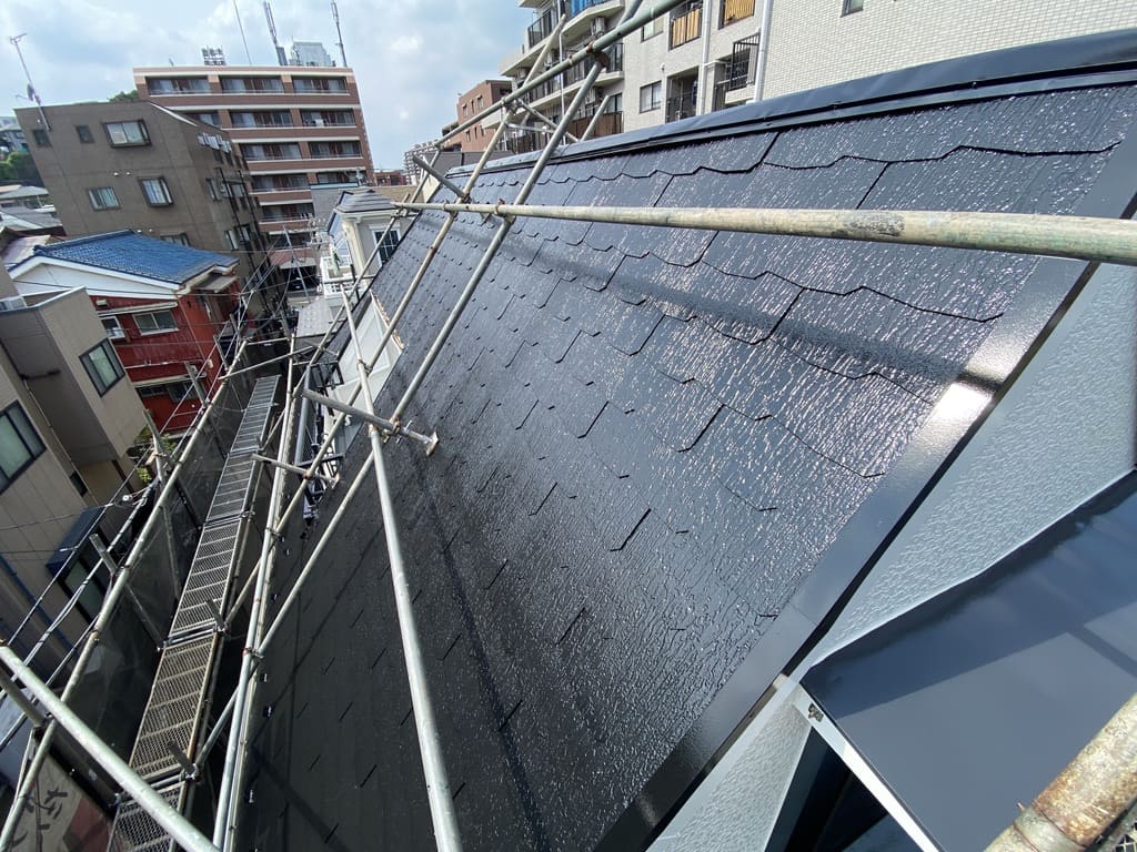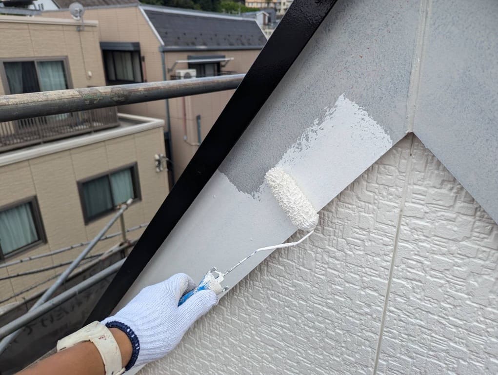 工事前の色決めの際には、お施主様から屋根は「ブラック」で外壁の帯も「黒系」で引き締めたいとのイメージをご共有いただいておりましたので、とてもスムーズに色決めが進み、「黒・白・グレー」の統一感あるデザイン塗装をご提案して採用していただきました。
