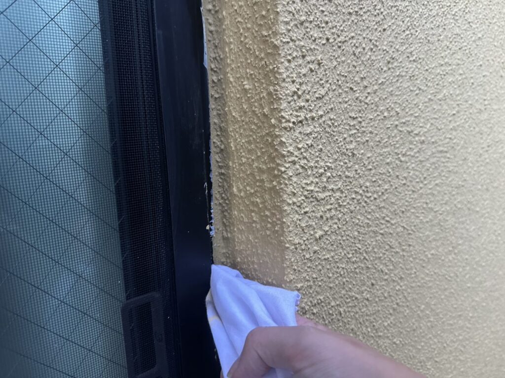 これは、サッシのまわりにはみ出した塗料をシンナーで拭き取り、仕上げの見切りを綺麗に整えているところです!このような細かい部分も丁寧に仕上げることで、よりきれいな外観に仕上がりました!