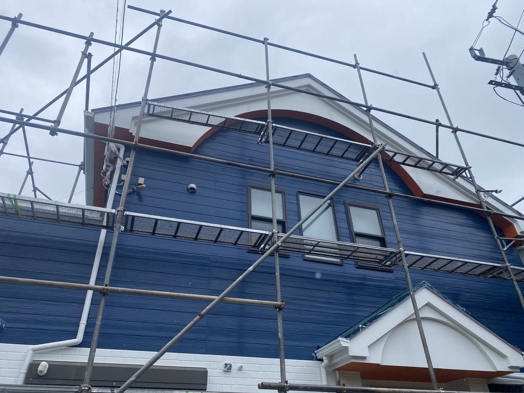 ワタルペイントの対策としては、足場の揺れを防止するため、現在施工中の現場で足場の点検を行い、メッシュシートを畳んで強風対策を行いました!