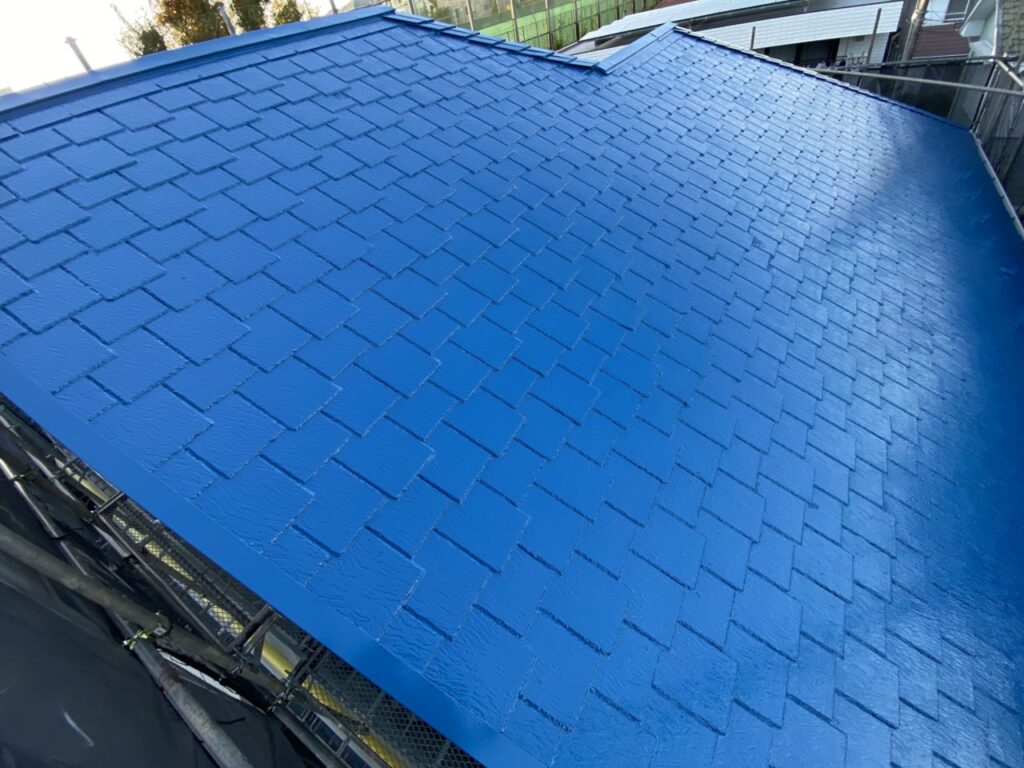 日本ペイントの標準色「ベネチアブルー」という色を使用して、元の青色より少し明るい素敵な屋根に変身しました!