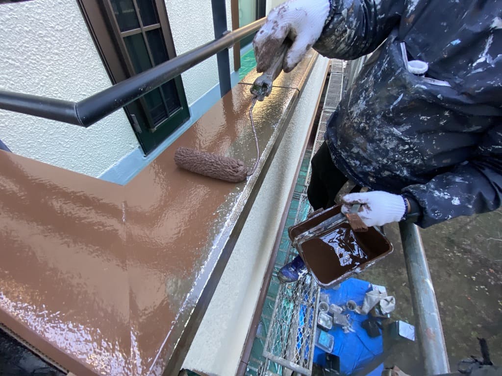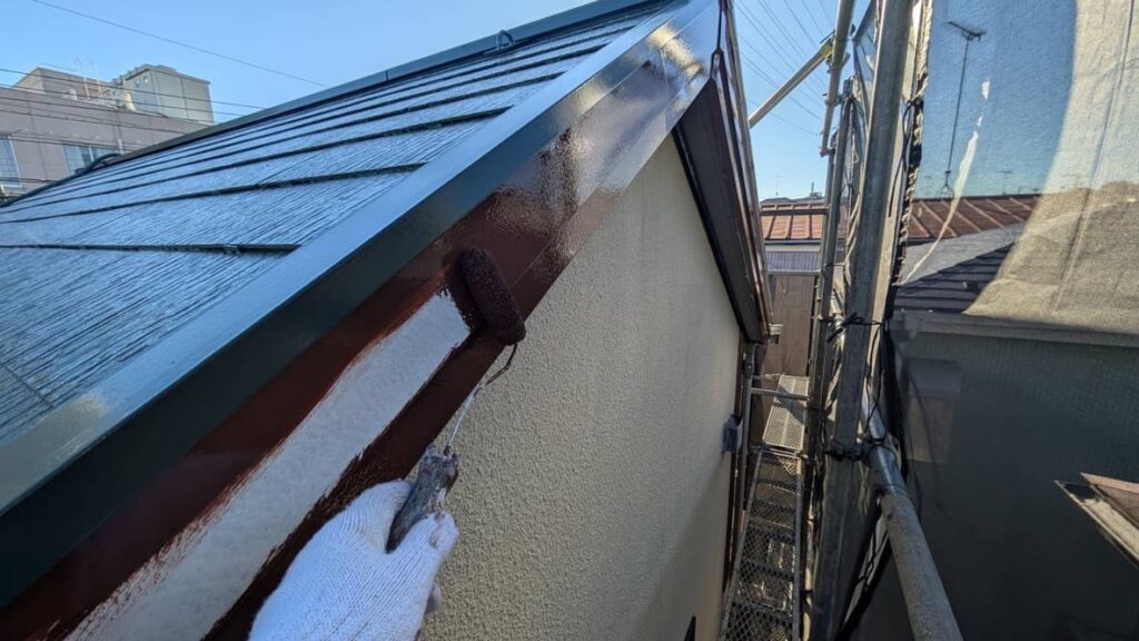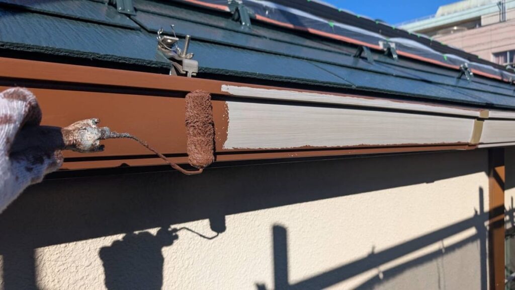 今回付帯部の塗装は落ち着いた艶の3分艶仕上げになるのですが、中塗りにはあえて艶あり塗料を塗装しています。