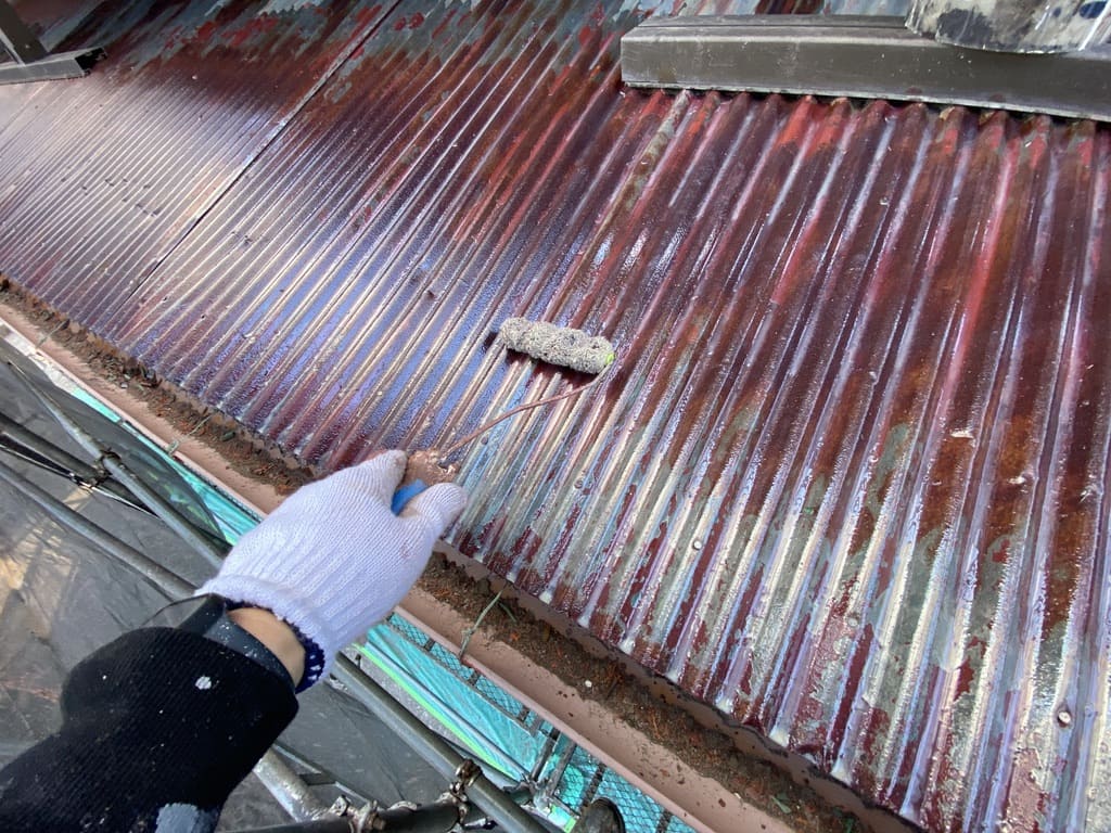 こちらのトタン屋根は赤錆が著しく、ケレンでは完全にさびを落とし切れないので下塗り前に一手間加えました。その様子がこちら↓