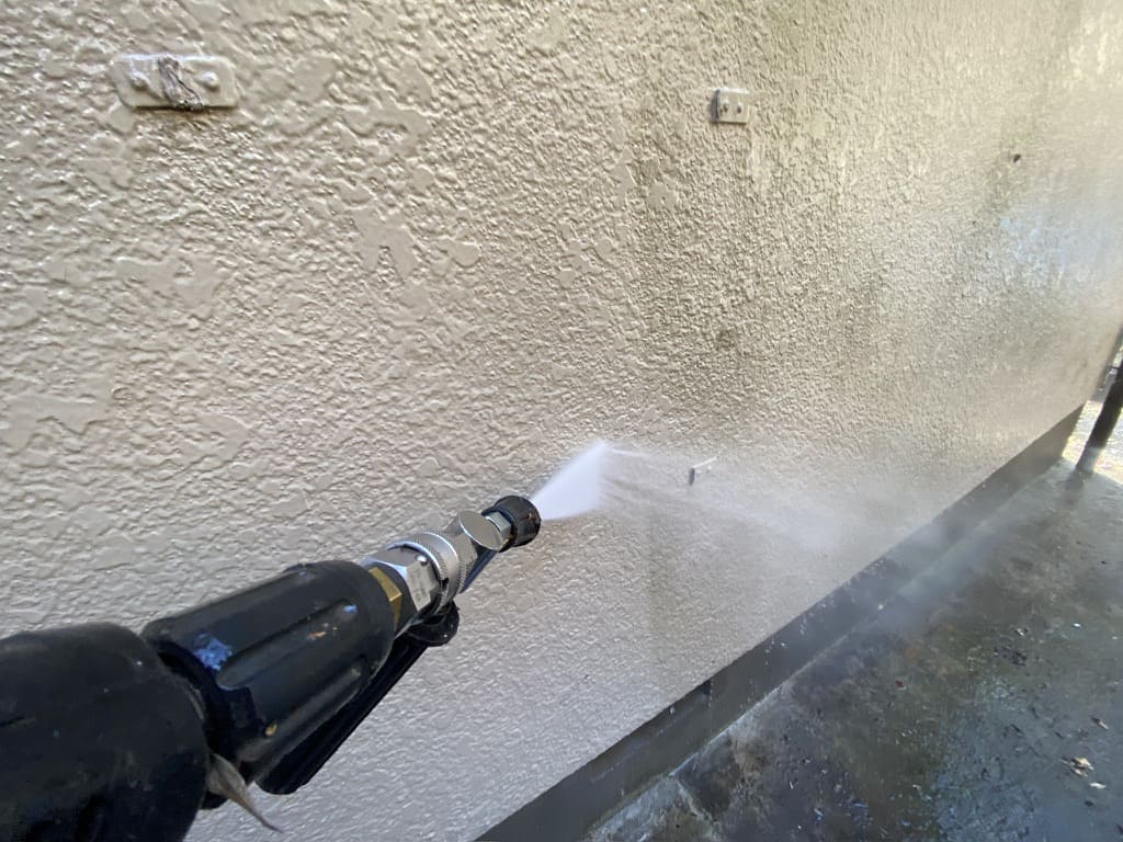 外壁塗装前の高圧洗浄では写真のような苔汚れはもちろん、劣化して粉状(チョーキング)になってしまっている塗装表面の粉を入念に洗い流していきます。