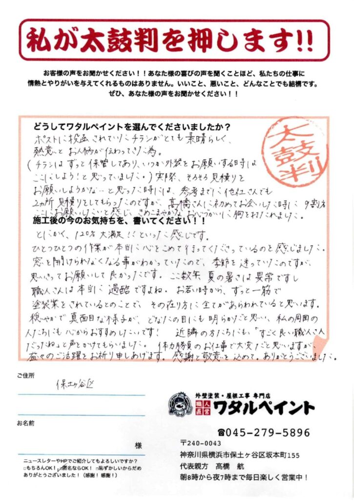 ここ数年、夏の暑さは異常ですし職人さんは本当に過酷ですよね。お若い時から、ずっと一筋で塗装業をされているとのことで、その在り方に全てがあらわれていると思います。穏やかで真面目な様子が、どなたの目にも明らかだと思い、私の周辺の人たちにも心からおすすめしたいです!