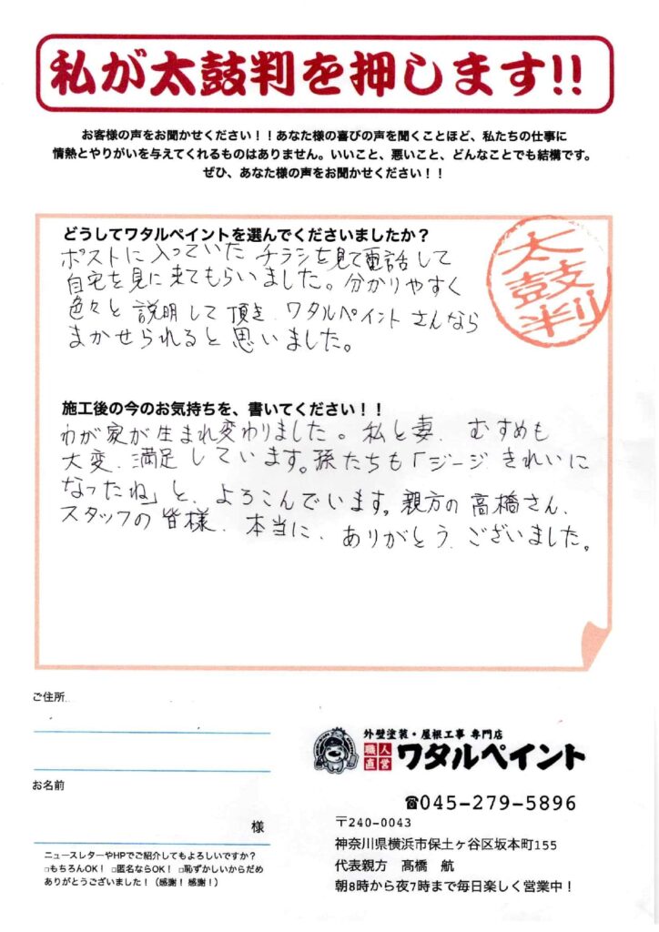 私と妻、娘も大変満足しています。孫たちも「ジージ、きれいになったね」と喜んでいます。親方の髙橋さん、スタッフの皆様、本当にありがとうございました。