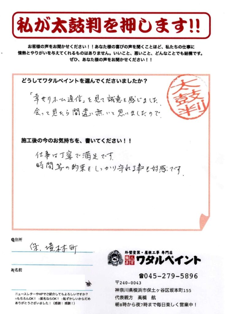 口コミ評判⭐️⭐️⭐️⭐️⭐️仕事が丁寧で時間の約束をしっかり守れる事も好感です。目次1 お客様の声1.1 ワタルペイントをお選びいただいた理由1.2 施工後のお気持ち2 こちらのお客様の工事詳細もご覧ください!お客様の声ワタルペイントをお選びいただいた理由ワタルペイントをお選びいただいた理由幸せリフォーム通信を見て誠意を感じました。会って見たら間違い無いと思いました。施工後のお気持ちお客様の声(施工後のお気持ち)仕事は丁寧で満足です。時間などの約束をしっかり守れる事も好感でした。こちらのお客様の工事詳細もご覧ください!関連記事浸透型塗料で木目を活かした美しい仕上がり![保土ケ谷区境木本町]無料お見積はこちら