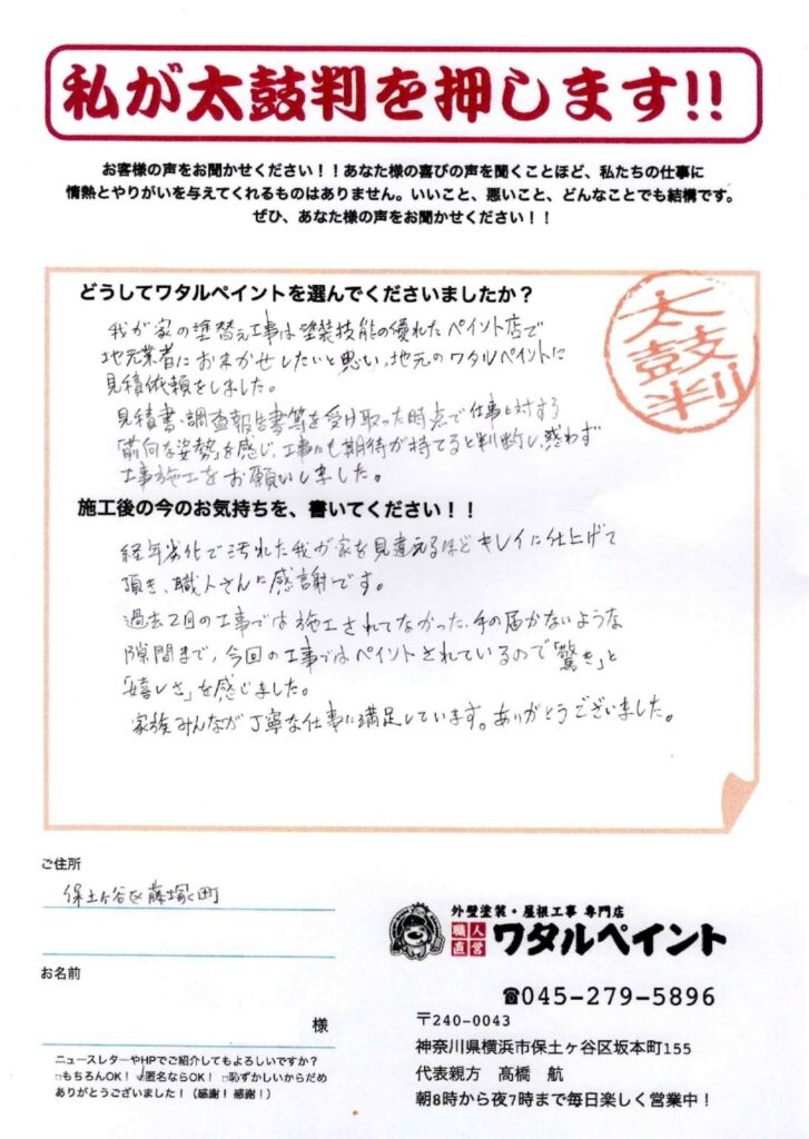 我が家の塗替え工事は塗装技能の優れたペイント店で地元業者にお任せしたいと思い、地元のワタルペイントに見積依頼をしました。