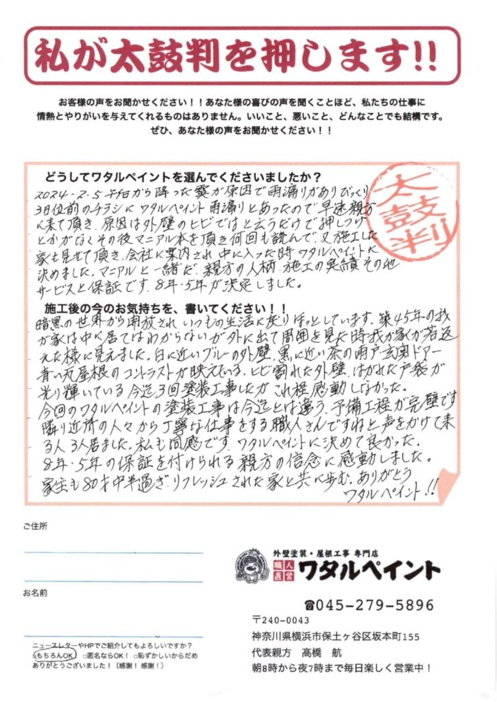 3日位前のチラシにワタルペイント雨漏りとあったので早速親方に来て頂き、原因は外壁のヒビではと言うだけで押しつけとかがなくその後マニュアル本を頂き何回も読んで、又、施工した家も見せて頂き、会社に案内され中に入った時ワタルペイントに決めました。マニュアルと一緒だ、親方の人柄、施工の実績、その他サービスと保証です。8年・5年が決定しました。