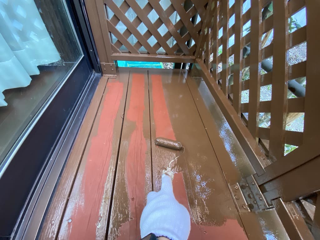 同時進行でベランダ床FRP防水のトップコートを施工していきます。