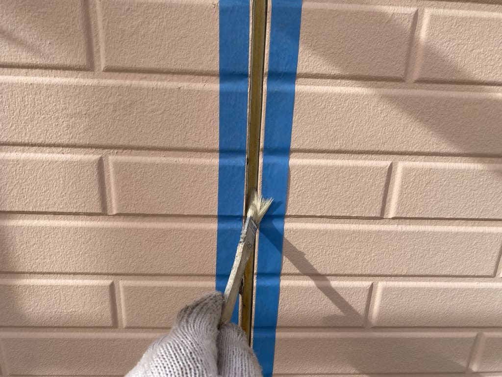 コーキングを充填する際にまわりを汚さないようマスキングテープで養生を行い、コーキングの接着を高めるためのプライマーを塗布していきます。