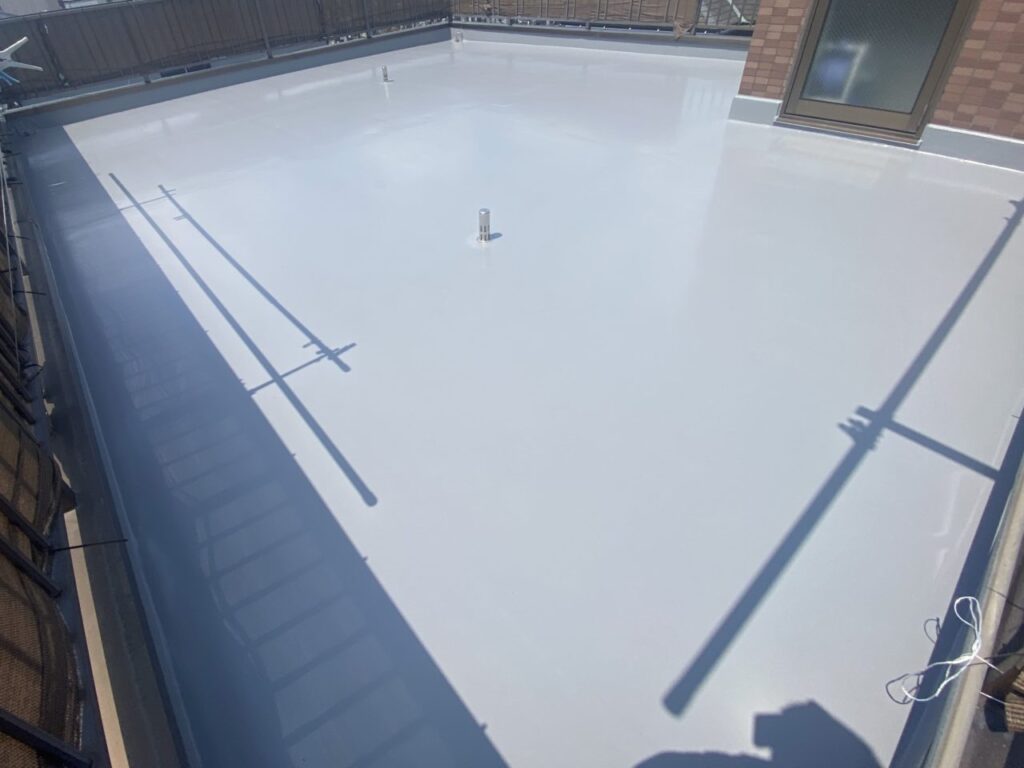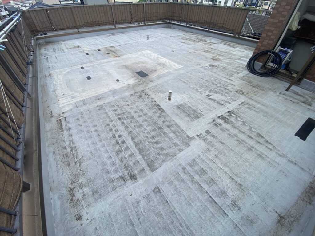 前回防水施工を行ってから年数が経ち、全体的に防水層の破れや穴あきなどの劣化が進行していた為、今回はウレタン防水の再施工をご提案させていただきました。