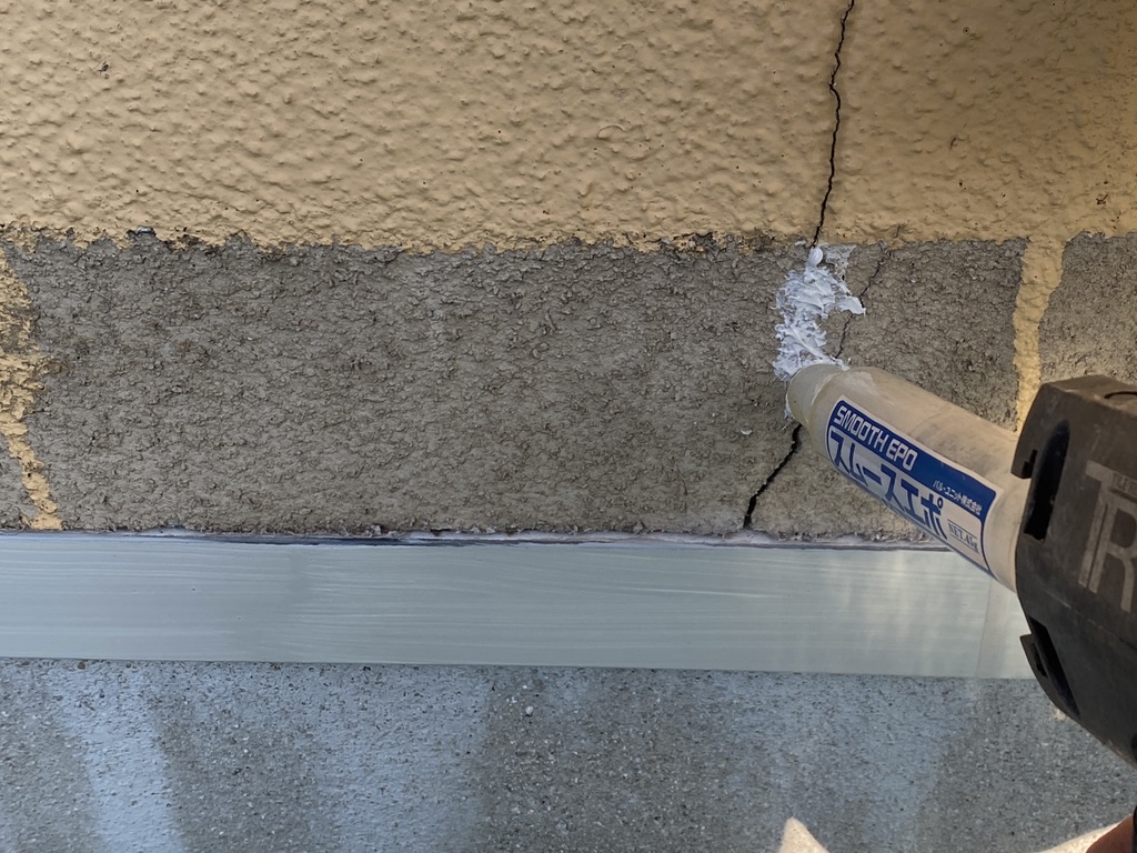 補修にはスムースエポを使用し、ひび割れの奥深くまで補修材を注入していきます。