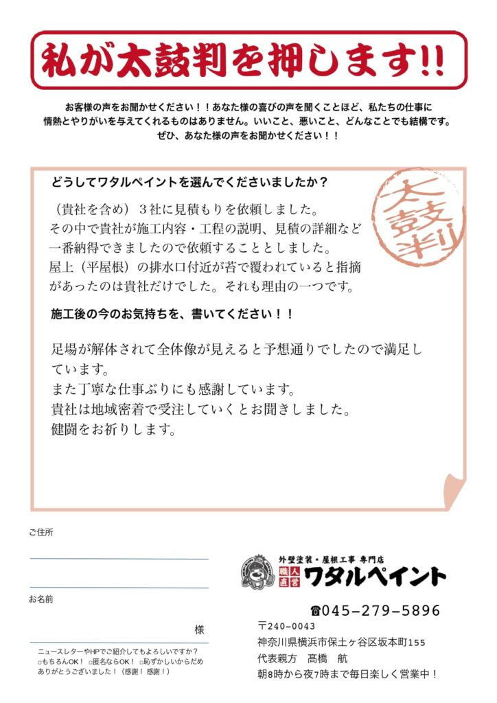 この度はワタルペイントをご信頼いただき、誠にありがとうございました。
