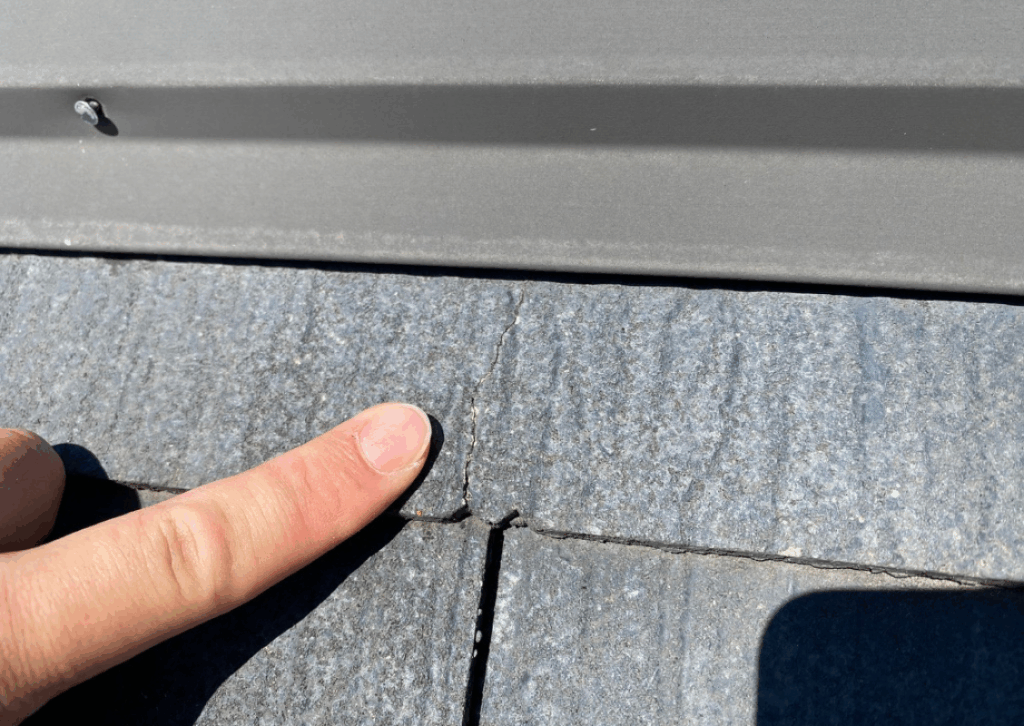 屋根に登った際にはたくさんのひび割れが発覚し、今回は屋根の塗装ではなくカバー工法をご提案させていただきました。
