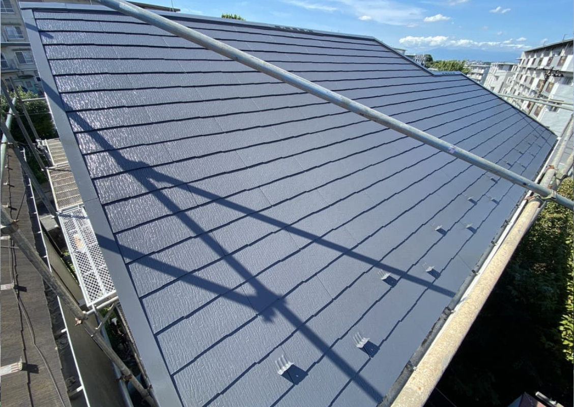 仕上げ塗りを2回行い、たっぷりの塗料で高級感あるメタリックな銀黒の屋根に仕上がりました。