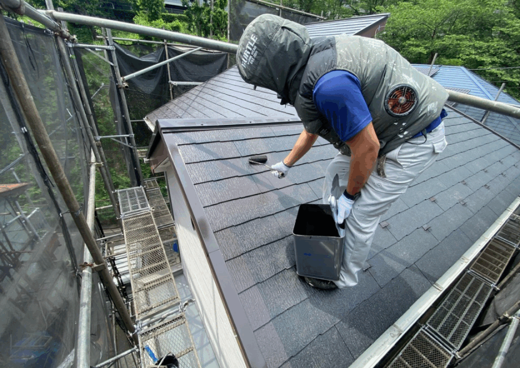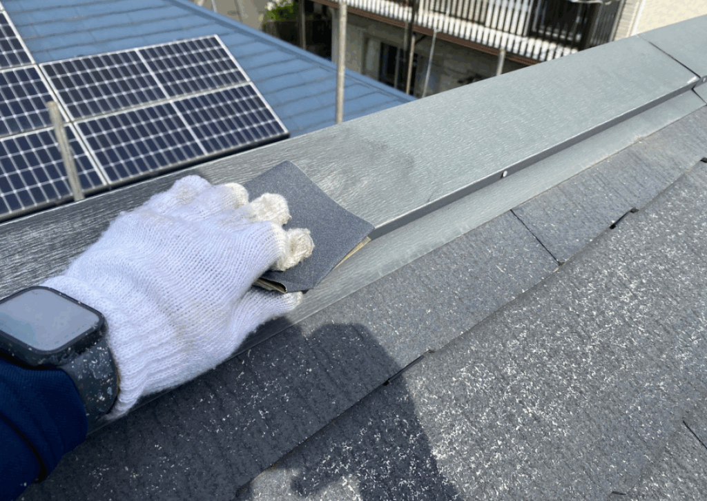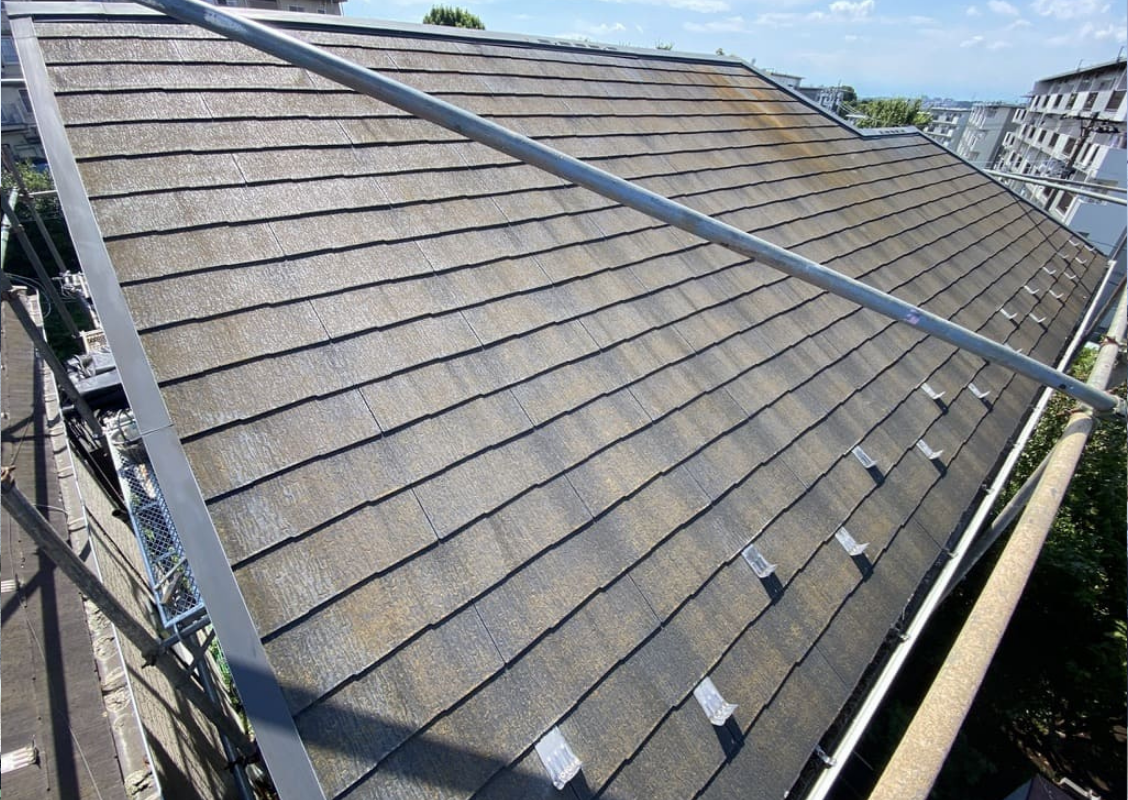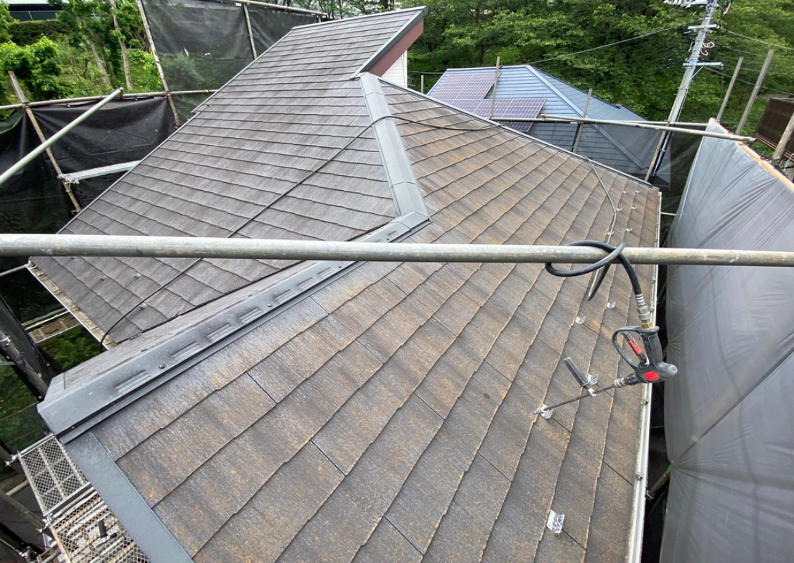 高圧洗浄では、屋根についてしまったコケやカビ、汚れ、前回塗装の塗膜等の不純物などを取り除きます。そうすることで、塗装が剥がれにくくなります。